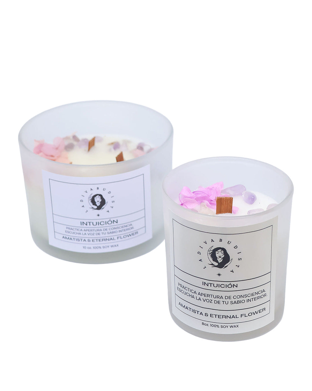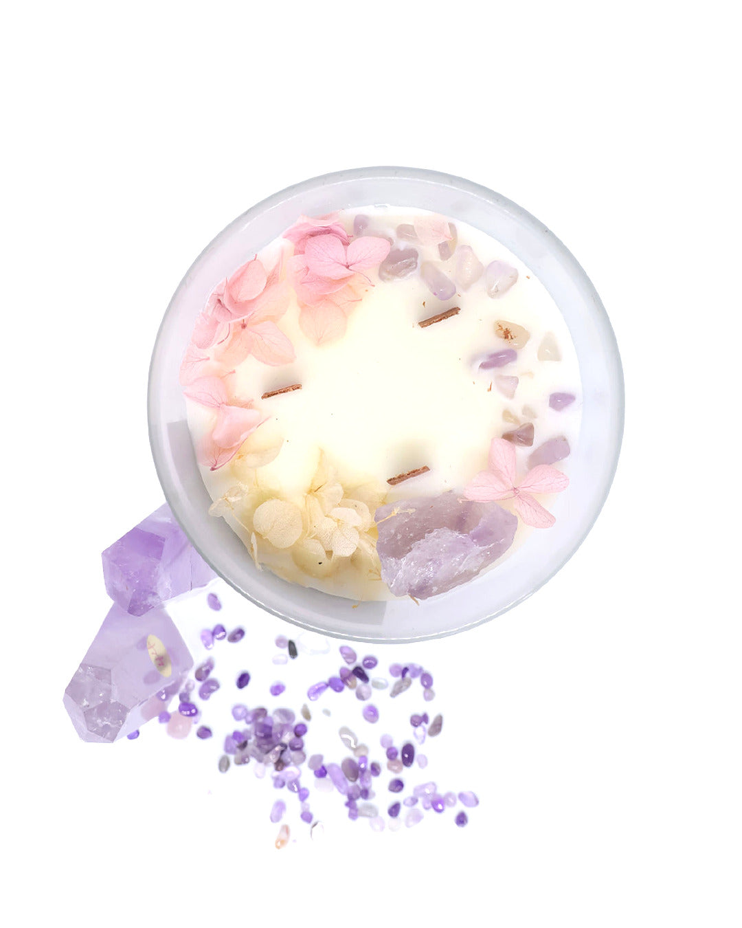Vela de soya Infundida con amatista y eternal flower e intencionada para el contacto con tu versión más elevada.