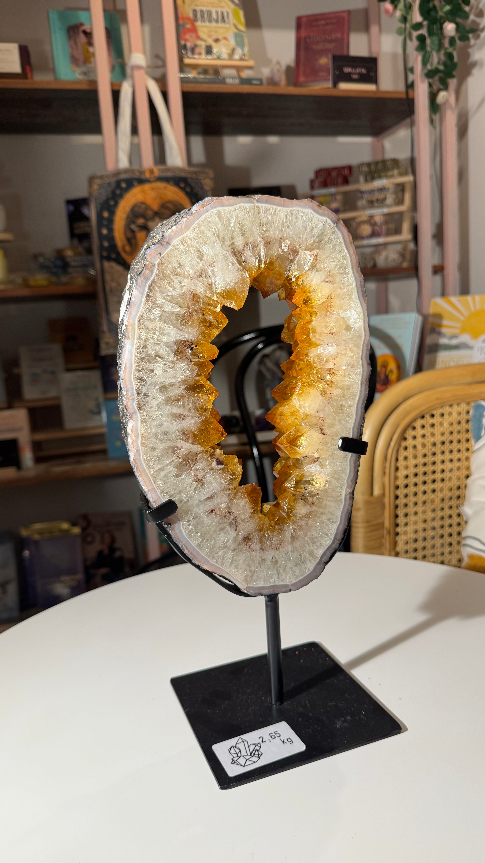 El Cuarzo Citrino irradia pureza y una energía luminosa que amplifica la conexión espiritual, limpia los espacios y eleva la vibración del entorno.