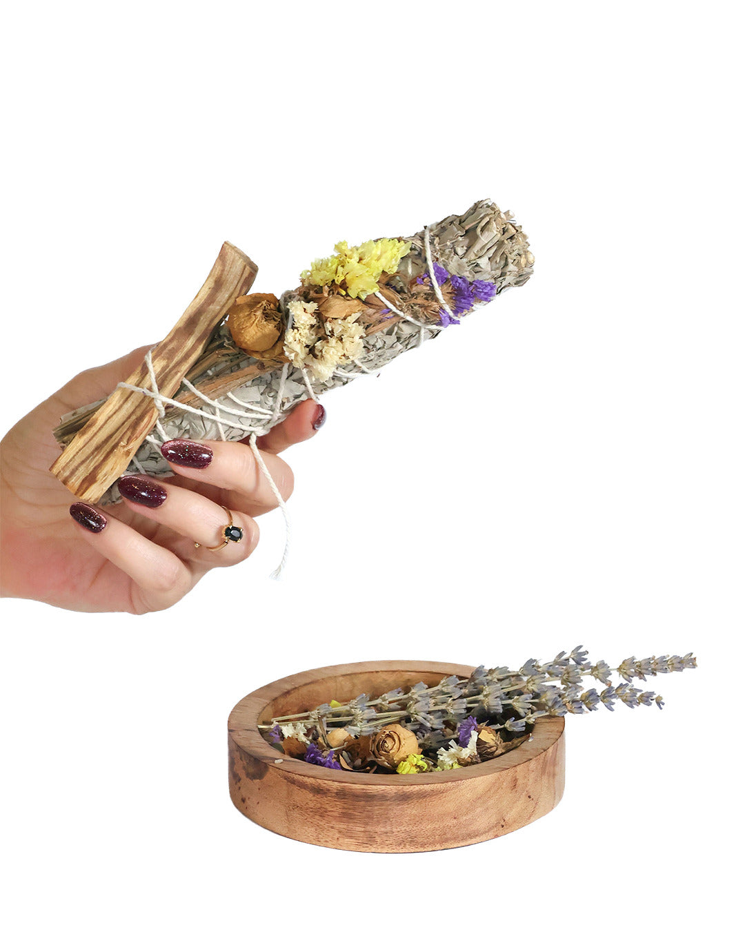 Este sahumerio tan divino está decorado con rosas, siempre viva y palo santo. Es perfecto para atraer belleza, amor y energía positiva a tu vida y espacios. Hermoso para regalo.