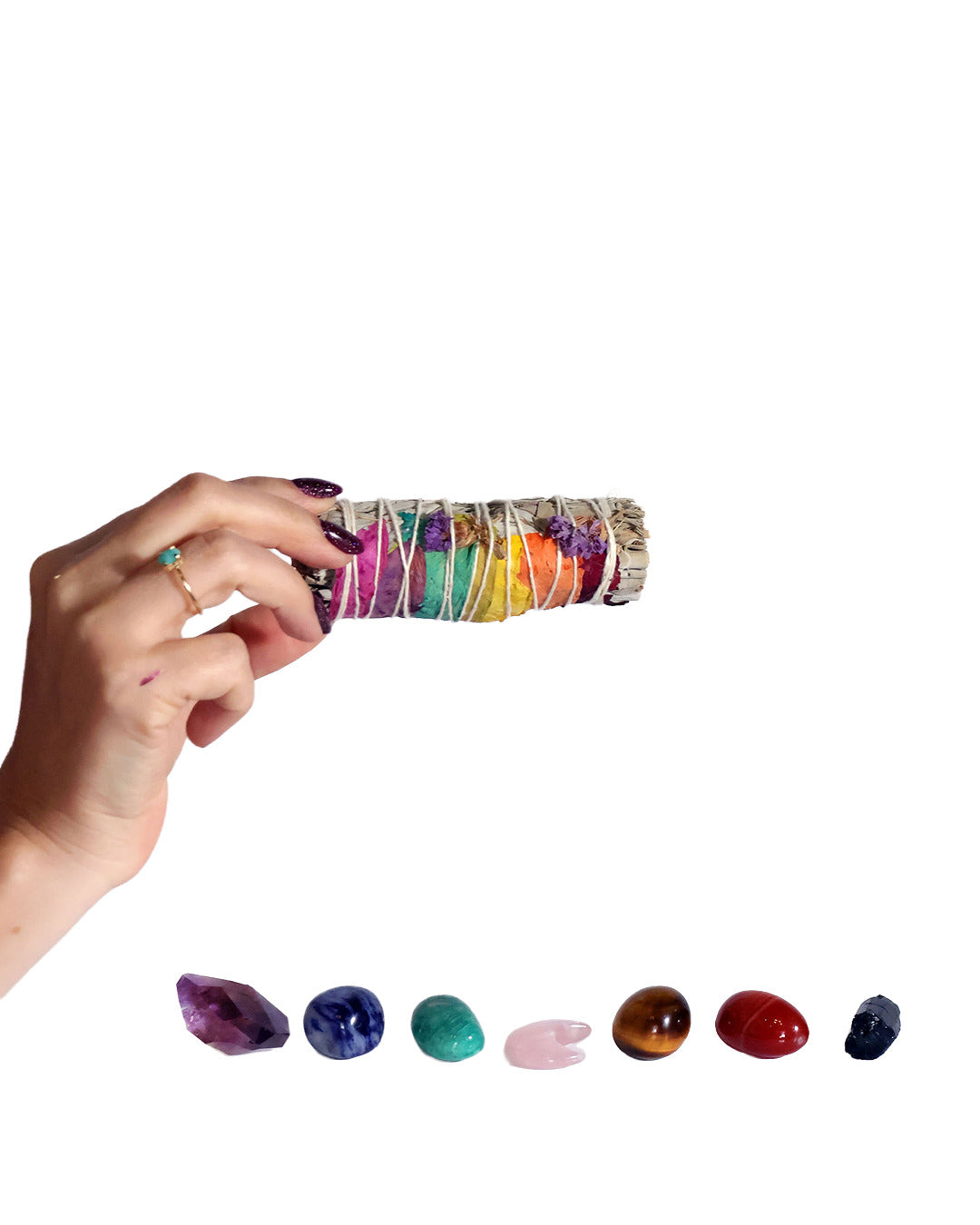 Este sahumerio combina salvia blanca para limpiar y proteger. Los pétalos de rosas representan los 7 chakras y la sinuata morada para aporta serenidad y fuerza espiritual. Ideal para equilibrar tu energía, abrir caminos y embellecer tus rituales de conexión interior.
