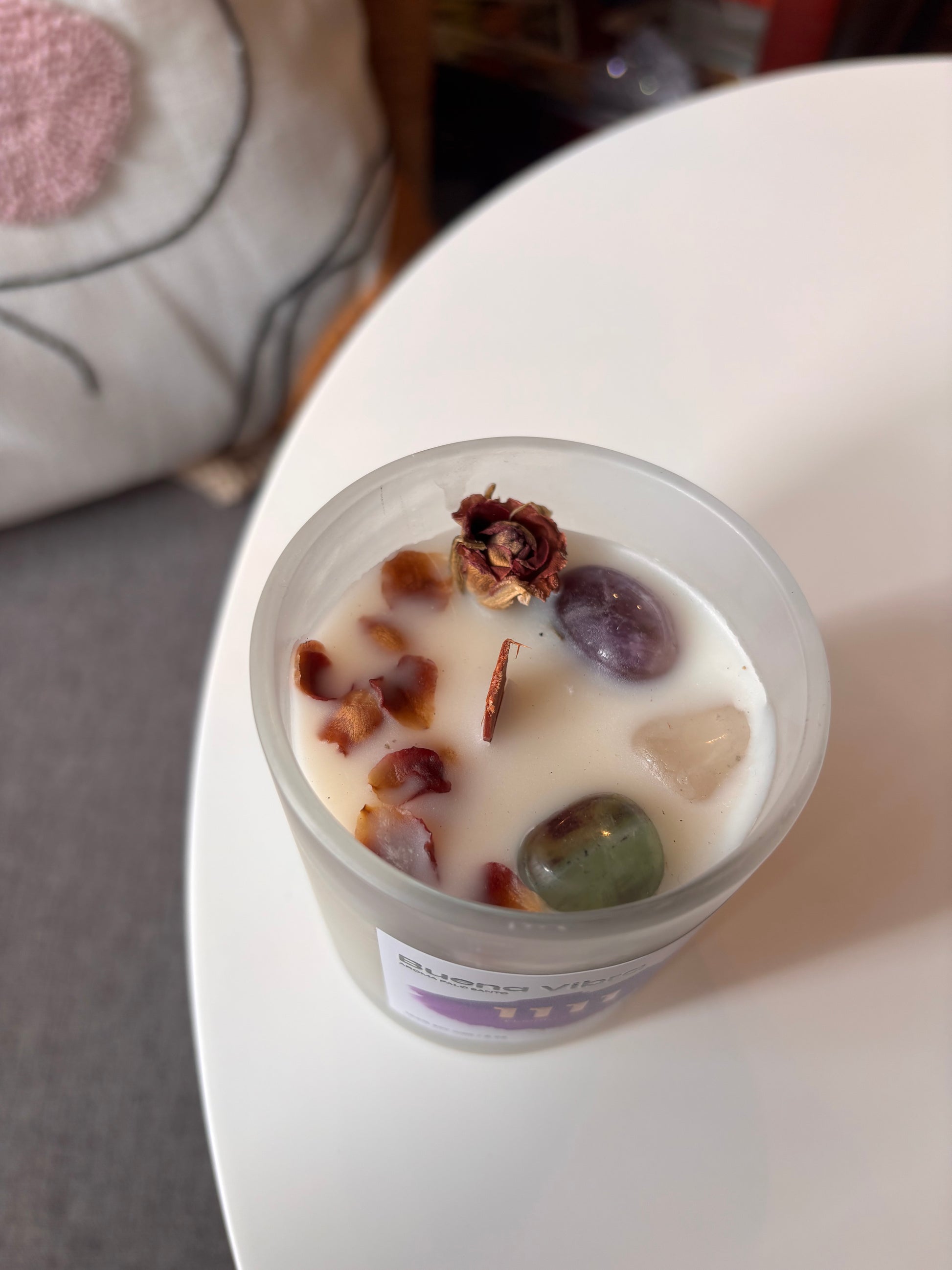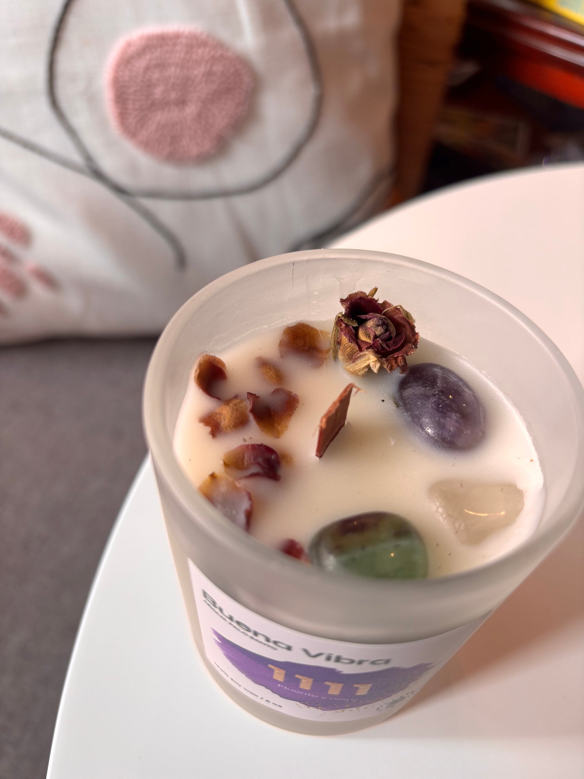 Una mezcla suave y cálida inspirada en esos momentos en los que necesitas resetear el mood. Su aroma a palo santo crea un ambiente acogedor, mientras que la fluorita y las rocas decorativas añaden un toque visual moderno y vibrante. Es una vela ideal para iniciar rutinas, mañanas creativas o simplemente elevar el ambiente.